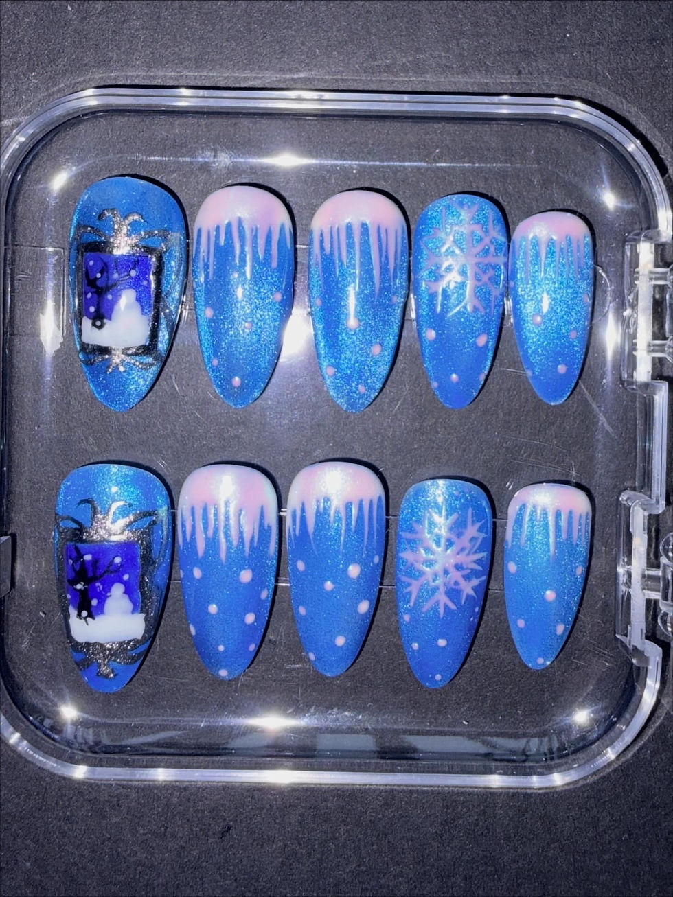 Hand painted Blue Cat Eye Winter Wonderland Press on Nails with Frame Nail Art